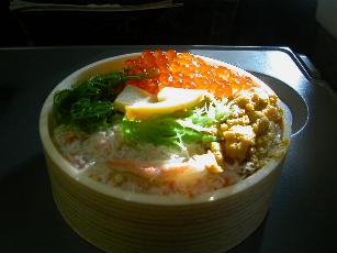 ●海鮮小わっぱ JR八戸駅 いくら、かに、あわび、うに、青とさか、おごのり なんと贅沢なこの逸品(^^) 2003.3.2 \800 |