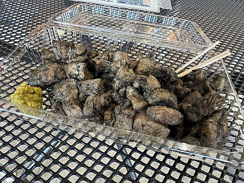 ![]() ●地頭鶏炭火焼 川南SA(河南町) 温泉の営業開始の時間調整のつもりで立ち寄ったパーキングエリア。 ふと見つけた売店で地鶏をいただくことに 味付けが見事です。 歯応えのある美味しい地鶏で柚子胡椒でいただくとさらに美味しいです♪ 2024.7.21 \1,200 9点 |