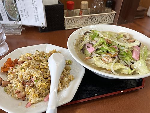 ![]() ●ちゃんぽんセット 大盛食楽(雲仙市) 焼きめしのセットですね。配膳されたとき においだけで「絶対おいしい!」と確信した一品です。 満足です! 2022.5.02 \1,000 9点 |