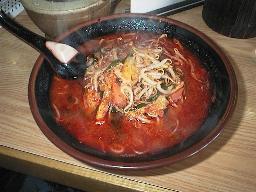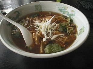 ●赤湯からみそラーメン 龍上海(南陽市) 超有名店ですね。 からみそは唐辛子のカタマリ?? 汗を拭き拭き食べました。 2003.1.3 \700 |