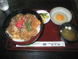 ●くま丼 むら熊(中山町) かつ丼と牛丼が合体したもの。 生卵をぶっかけて食べます。 2001.8.11 \980 |