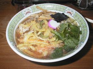 ●天ぷららーめん いろは本店(河北町) 天ぷらとらーめんの組み合わせ。 結構いいかも(^^)違和感なく食べました。 天ぷらはかき揚げがばらばらになったみたいなもの 2002.12.31 \700 |